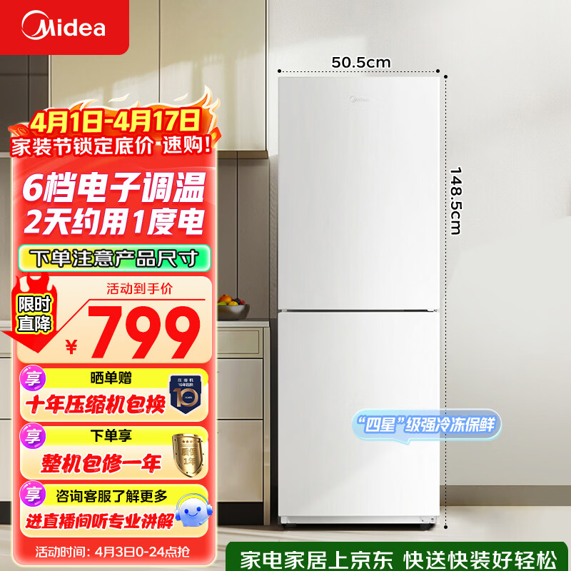 美的(Midea)181L两门冰箱白色两门小户型客厅家用电冰箱租房宿舍低音节能低噪可冷藏冷冻不占地MR-190E