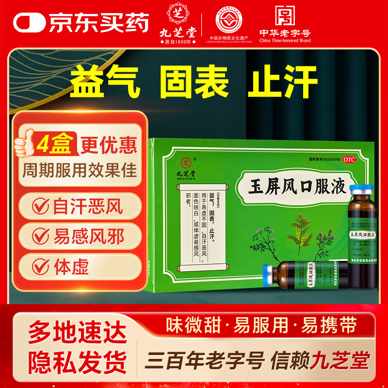 九芝堂 玉屏风口服液 10ml*6支益气固表止汗含黄芪用于表虚不固自汗恶风体虚易感风邪者京东自营