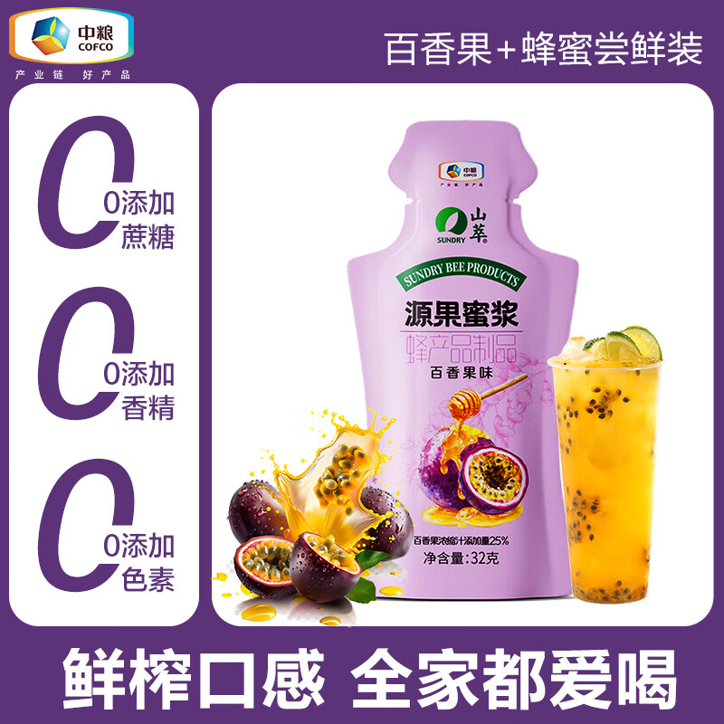 山萃中粮蜂蜜百香果汁源果蜜浆便携装32g水果茶孕妇儿童老人白领