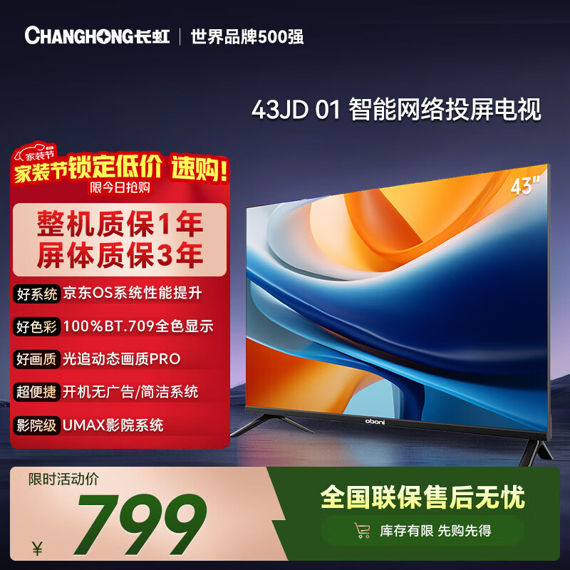 长虹欧宝丽京东联名款 京东OS 43JD 01 43英寸 欧宝丽 无开机广告 无线投屏 智能电视 43Z60H