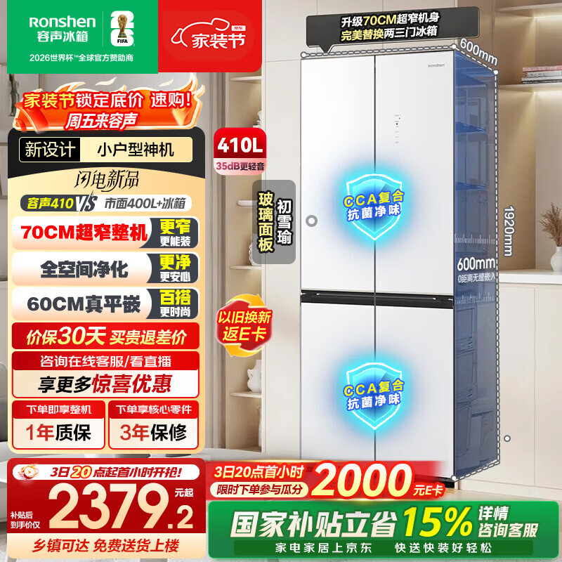 容声小方糕410L十字门冰箱玻璃超薄零嵌入式小户型一级能效风冷无霜双变频BCD-410E30CZGAD国家补贴