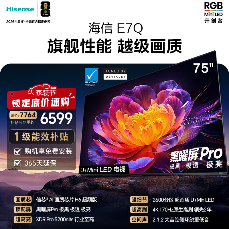 海信电视E7Q 75英寸 信芯芯片H6超频版 黑曜屏Pro XDR5200nits 2600分区 国家补贴 世界杯电视75E7Q