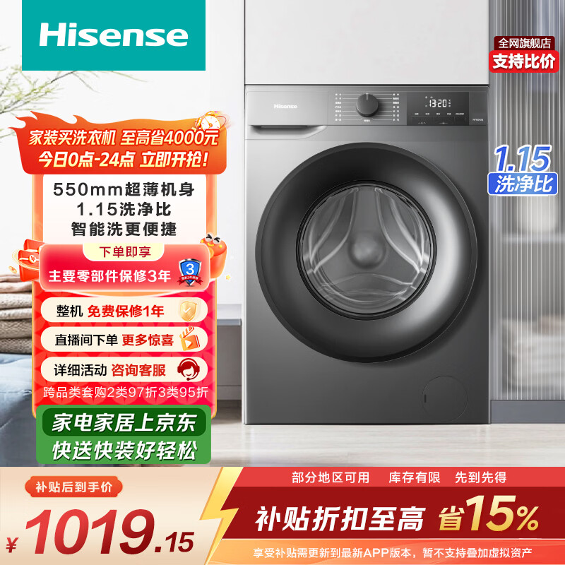 海信(Hisense)全自动滚筒单洗洗衣机 10KG超薄高洗净比一级能效小型出租家用WF100A0Q以旧换新家电补贴 京东自营