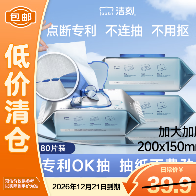 洁刻湿厕纸 纯水款80抽x4包湿纸巾 厕所湿巾可冲马桶厕纸【临期清仓】