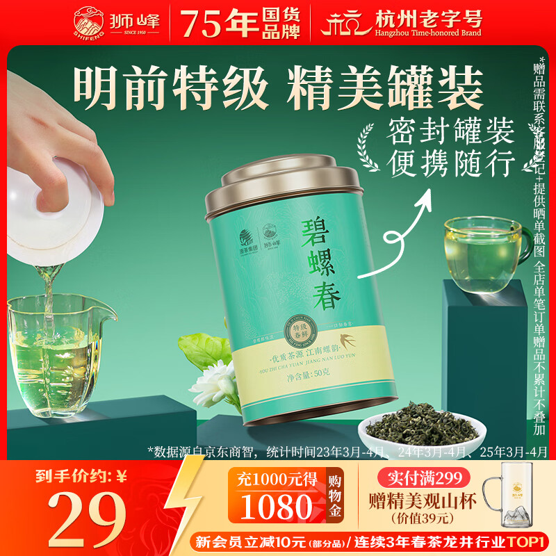 狮峰牌绿茶碧螺春茶叶 明前特级50g罐装送长辈送礼自己喝