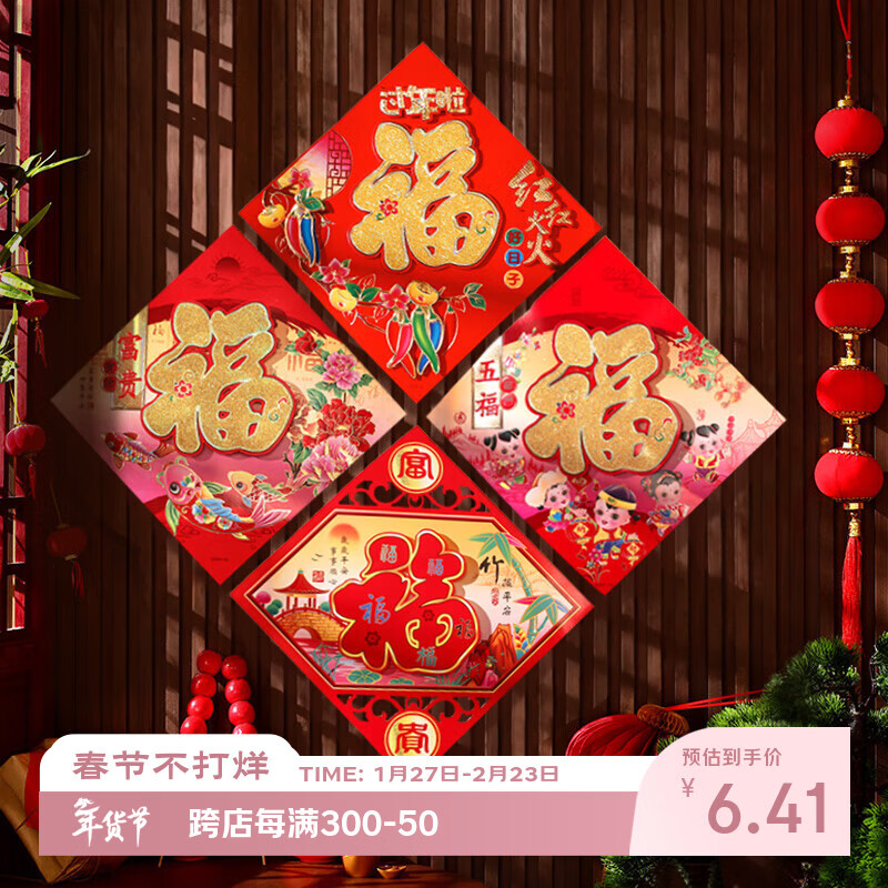 仕彩 新年装饰福字贴画4张过春节家用入户门2026马年布置福字门墙挂画