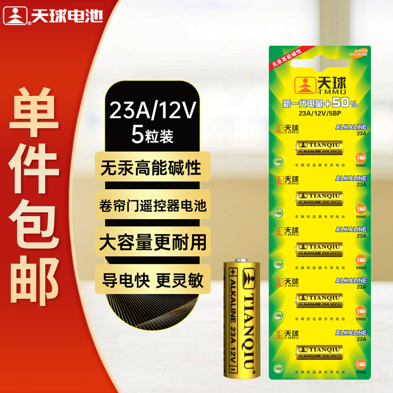 天球23A12V电池5粒高伏碱性电池适用于遥控器车辆防盗器/电子词典电动卷帘门引闪器干电池23a一件包邮