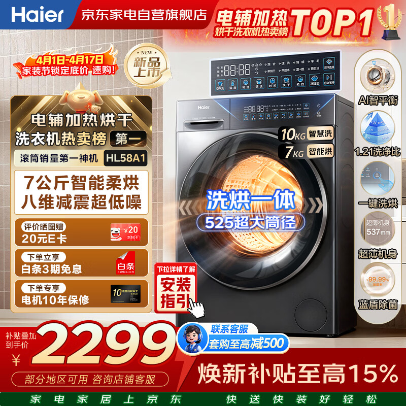 海尔滚筒洗衣机全自动带烘干10KG 新品 537超薄平嵌 525大筒 蓝盾除菌 商场同款 防生锈XQG100-HL58A1