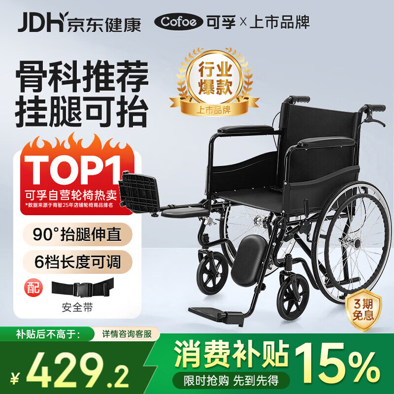 可孚手动轮椅车年轻人骨折老人专用可抬腿伸直腿托折叠SYIV100-HY9113